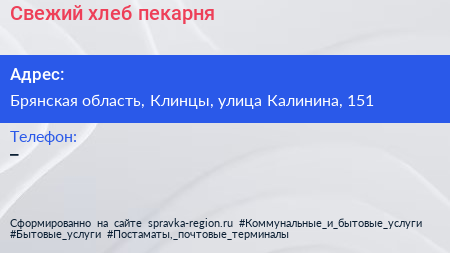 Свежий хлеб, пекарня по адресу Брянская область, Клинцы, улица Калинина, 151 в дальнейшем Организация, размещена в следующих категориях: