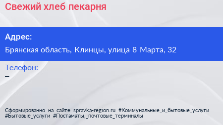 Свежий хлеб, пекарня по адресу Брянская область, Клинцы, улица 8 Марта, 32 в дальнейшем Организация, размещена в следующих категориях: