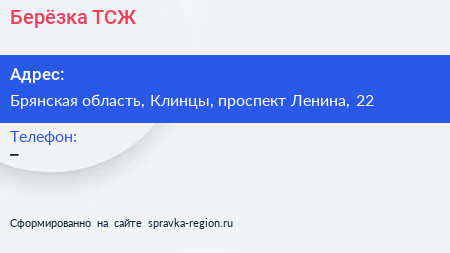 Берёзка, ТСЖ по адресу Брянская область, Клинцы, проспект Ленина, 22 в дальнейшем Организация, размещена в следующих категориях: