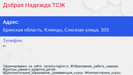 Добрая Надежда, ТСЖ по адресу Брянская область, Клинцы, Союзная улица, 103 в дальнейшем Организация, размещена в следующих категориях:
