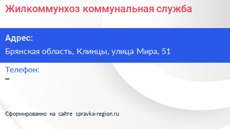 Жилкоммунхоз, коммунальная служба по адресу Брянская область, Клинцы, улица Мира, 51 в дальнейшем Организация, размещена в следующих категориях: