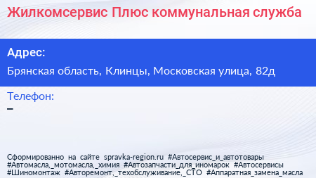 Жилкомсервис Плюс, коммунальная служба по адресу Брянская область, Клинцы, Московская улица, 82д в дальнейшем Организация, размещена в следующих категориях: