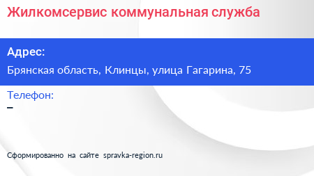 Жилкомсервис, коммунальная служба по адресу Брянская область, Клинцы, улица Гагарина, 75 в дальнейшем Организация, размещена в следующих категориях: