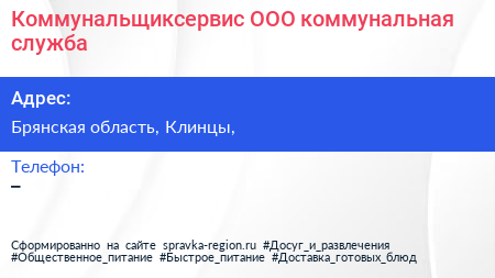 Коммунальщиксервис, ООО, коммунальная служба по адресу Брянская область, Клинцы, в дальнейшем Организация, размещена в следующих категориях: