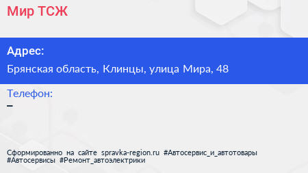 Мир, ТСЖ по адресу Брянская область, Клинцы, улица Мира, 48 в дальнейшем Организация, размещена в следующих категориях: