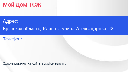 Мой Дом, ТСЖ по адресу Брянская область, Клинцы, улица Александрова, 43 в дальнейшем Организация, размещена в следующих категориях: