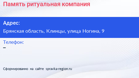 Память, ритуальная компания по адресу Брянская область, Клинцы, улица Ногина, 9 в дальнейшем Организация, размещена в следующих категориях: