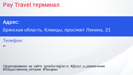 Pay.Travel, терминал по адресу Брянская область, Клинцы, проспект Ленина, 21 в дальнейшем Организация, размещена в следующих категориях: