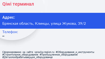 Qiwi, терминал по адресу Брянская область, Клинцы, улица Жукова, 39/2 в дальнейшем Организация, размещена в следующих категориях: