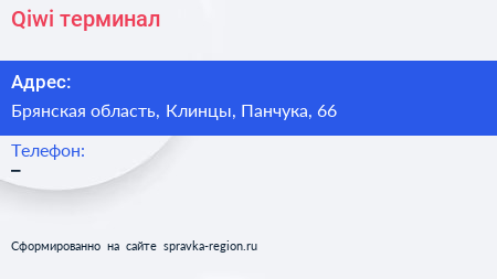 Qiwi, терминал по адресу Брянская область, Клинцы, Панчука, 66 в дальнейшем Организация, размещена в следующих категориях:
