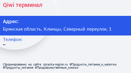 Qiwi, терминал по адресу Брянская область, Клинцы, Северный переулок, 1 в дальнейшем Организация, размещена в следующих категориях: