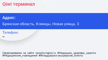 Qiwi, терминал по адресу Брянская область, Клинцы, Новая улица, 3 в дальнейшем Организация, размещена в следующих категориях: