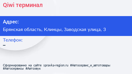 Qiwi, терминал по адресу Брянская область, Клинцы, Заводская улица, 3 в дальнейшем Организация, размещена в следующих категориях: