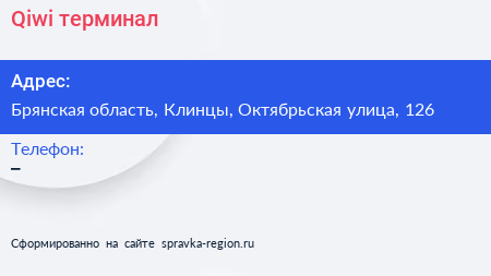 Qiwi, терминал по адресу Брянская область, Клинцы, Октябрьская улица, 126 в дальнейшем Организация, размещена в следующих категориях: