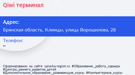 Qiwi, терминал по адресу Брянская область, Клинцы, улица Ворошилова, 28 в дальнейшем Организация, размещена в следующих категориях: