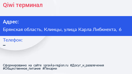 Qiwi, терминал по адресу Брянская область, Клинцы, улица Карла Либкнехта, 6 в дальнейшем Организация, размещена в следующих категориях: