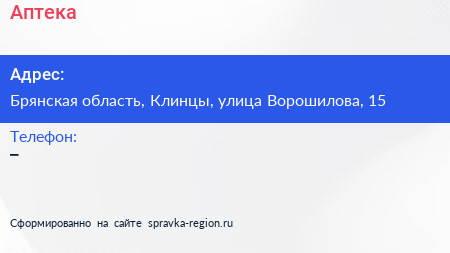Аптека по адресу Брянская область, Клинцы, улица Ворошилова, 15 в дальнейшем Организация, размещена в следующих категориях: