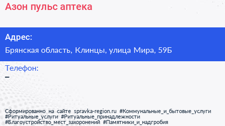Азон пульс, аптека по адресу Брянская область, Клинцы, улица Мира, 59Б в дальнейшем Организация, размещена в следующих категориях: