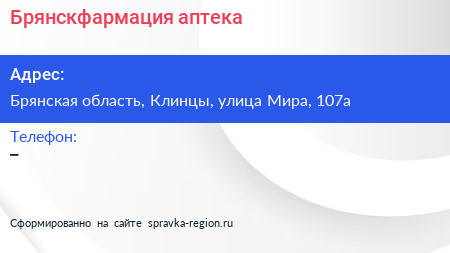Брянскфармация, аптека по адресу Брянская область, Клинцы, улица Мира, 107а в дальнейшем Организация, размещена в следующих категориях: