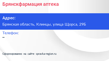 Брянскфармация, аптека по адресу Брянская область, Клинцы, улица Щорса, 29Б в дальнейшем Организация, размещена в следующих категориях: