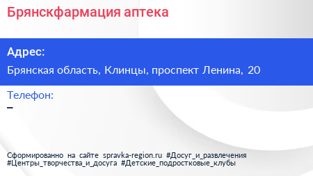 Брянскфармация, аптека по адресу Брянская область, Клинцы, проспект Ленина, 20 в дальнейшем Организация, размещена в следующих категориях: