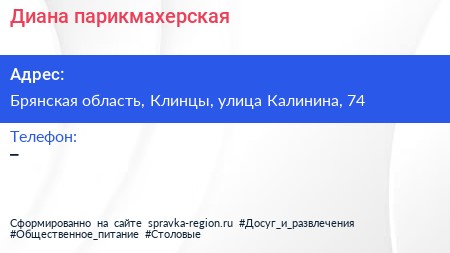 Диана, парикмахерская по адресу Брянская область, Клинцы, улица Калинина, 74 в дальнейшем Организация, размещена в следующих категориях: