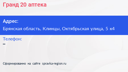 Гранд №20, аптека по адресу Брянская область, Клинцы, Октябрьская улица, 5 к4 в дальнейшем Организация, размещена в следующих категориях: