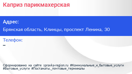 Каприз, парикмахерская по адресу Брянская область, Клинцы, проспект Ленина, 30 в дальнейшем Организация, размещена в следующих категориях: