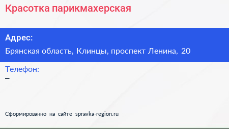 Красотка, парикмахерская по адресу Брянская область, Клинцы, проспект Ленина, 20 в дальнейшем Организация, размещена в следующих категориях: