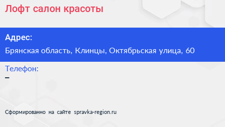 Лофт, салон красоты по адресу Брянская область, Клинцы, Октябрьская улица, 60 в дальнейшем Организация, размещена в следующих категориях: