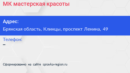 МК, мастерская красоты по адресу Брянская область, Клинцы, проспект Ленина, 49 в дальнейшем Организация, размещена в следующих категориях: