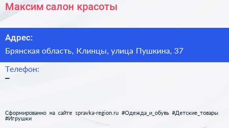 Максим, салон красоты по адресу Брянская область, Клинцы, улица Пушкина, 37 в дальнейшем Организация, размещена в следующих категориях: