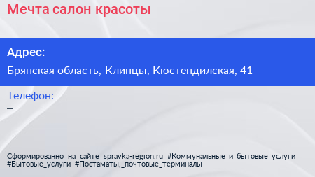 Мечта, салон красоты по адресу Брянская область, Клинцы, Кюстендилская, 41 в дальнейшем Организация, размещена в следующих категориях: