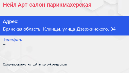 Нейл-Арт, салон-парикмахерская по адресу Брянская область, Клинцы, улица Дзержинского, 34 в дальнейшем Организация, размещена в следующих категориях:
