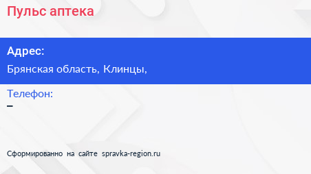 Пульс, аптека по адресу Брянская область, Клинцы, в дальнейшем Организация, размещена в следующих категориях:
