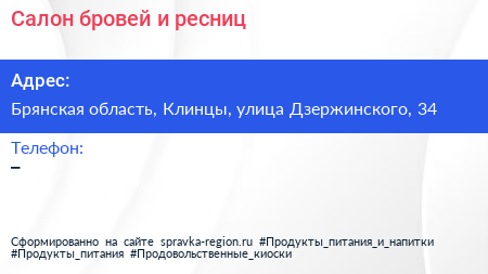 Салон бровей и ресниц по адресу Брянская область, Клинцы, улица Дзержинского, 34 в дальнейшем Организация, размещена в следующих категориях: