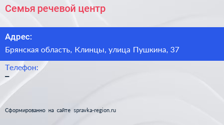 Семья, речевой центр по адресу Брянская область, Клинцы, улица Пушкина, 37 в дальнейшем Организация, размещена в следующих категориях: