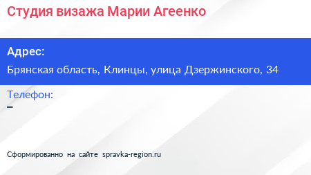 Студия визажа Марии Агеенко по адресу Брянская область, Клинцы, улица Дзержинского, 34 в дальнейшем Организация, размещена в следующих категориях:
