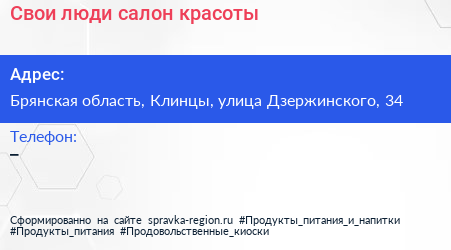 Свои люди, салон красоты по адресу Брянская область, Клинцы, улица Дзержинского, 34 в дальнейшем Организация, размещена в следующих категориях: