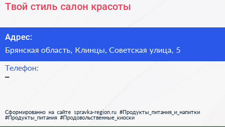 Твой стиль, салон красоты по адресу Брянская область, Клинцы, Советская улица, 5 в дальнейшем Организация, размещена в следующих категориях:
