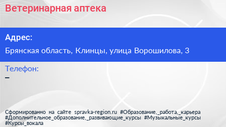 Ветеринарная аптека по адресу Брянская область, Клинцы, улица Ворошилова, 3 в дальнейшем Организация, размещена в следующих категориях: