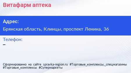 Витафарм, аптека по адресу Брянская область, Клинцы, проспект Ленина, 36 в дальнейшем Организация, размещена в следующих категориях: