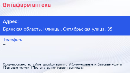 Витафарм, аптека по адресу Брянская область, Клинцы, Октябрьская улица, 35 в дальнейшем Организация, размещена в следующих категориях: