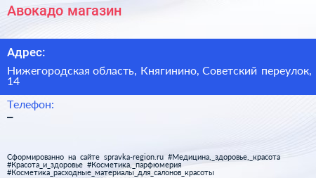 Авокадо, магазин по адресу Нижегородская область, Княгинино, Советский переулок, 14 в дальнейшем Организация, размещена в следующих категориях: