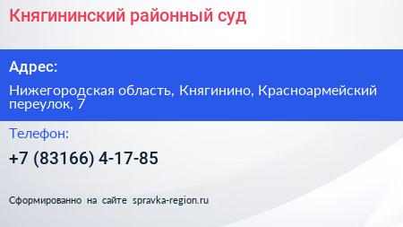 Княгининский районный суд по адресу Нижегородская область, Княгинино, Красноармейский переулок, 7 в дальнейшем Организация, размещена в следующих категориях:
