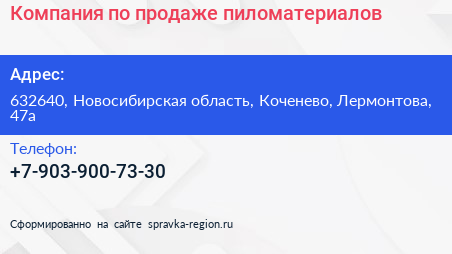 Компания по продаже пиломатериалов по адресу 632640, Новосибирская область, Коченево, Лермонтова, 47а в дальнейшем Организация, размещена в следующих категориях: