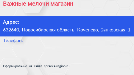 Важные мелочи, магазин по адресу 632640, Новосибирская область, Коченево, Банковская, 1 в дальнейшем Организация, размещена в следующих категориях:
