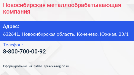 Новосибирская металлообрабатывающая компания по адресу 632641, Новосибирская область, Коченево, Южная, 23/1 в дальнейшем Организация, размещена в следующих категориях: