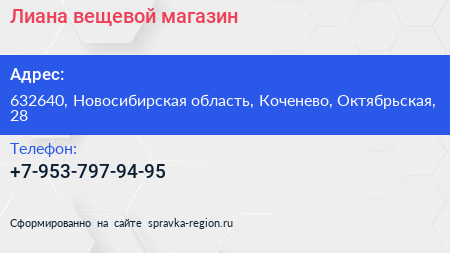 Лиана, вещевой магазин по адресу 632640, Новосибирская область, Коченево, Октябрьская, 28 в дальнейшем Организация, размещена в следующих категориях: