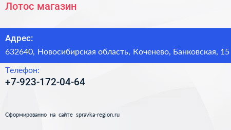 Лотос, магазин по адресу 632640, Новосибирская область, Коченево, Банковская, 15 в дальнейшем Организация, размещена в следующих категориях: